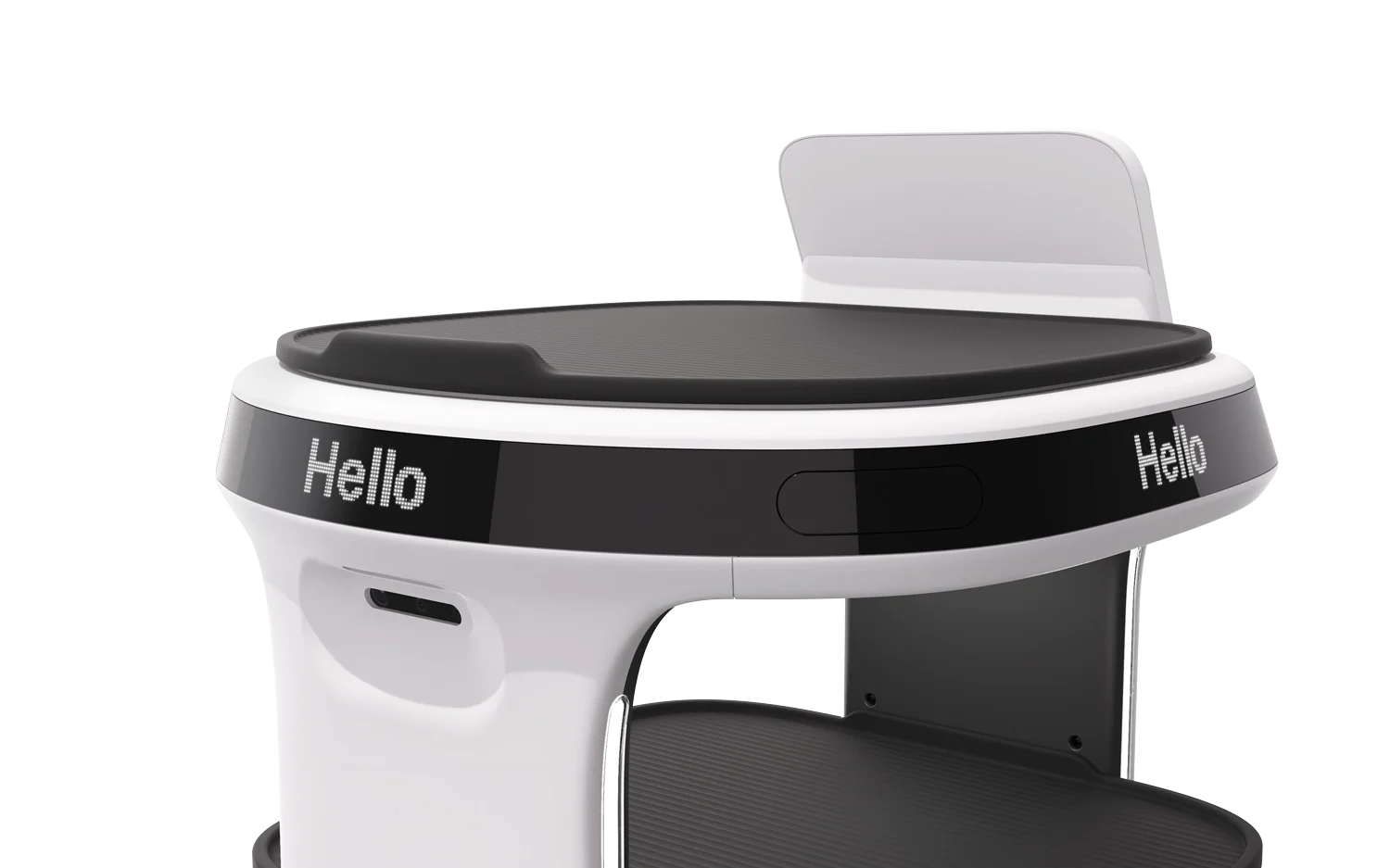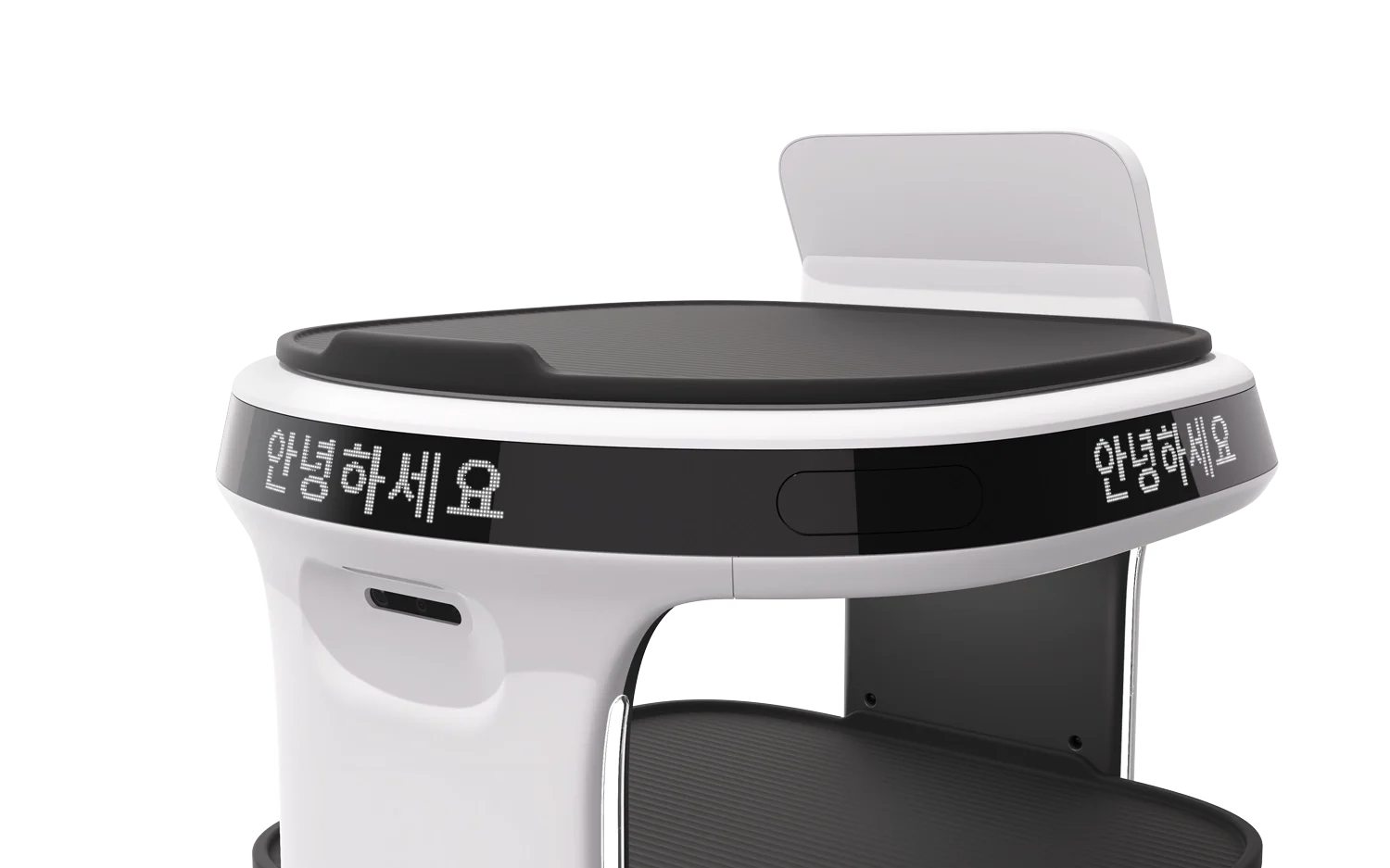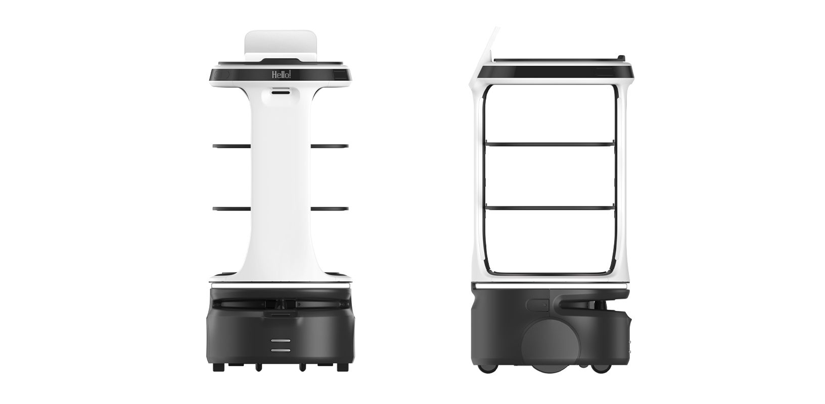 狭い場所でもスムーズに移動できるよう設計されたこのレストラン用ロボットは、全方向の障害物を検知しながら自律走行します。